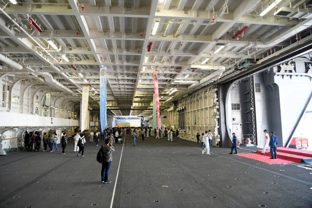 かがは全長248メートルで、基準排水量約1万9500トン。200人近く乗れるという大きなエレベーター2基をフル稼働して、見学者を甲板に運んだ。